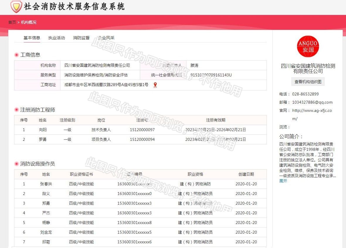 四川省安國(guó)建筑消防檢測(cè)有限責(zé)任公司,成立于1998年,經(jīng)四川省公安消防總隊(duì)批準(zhǔn),工商部門(mén)注冊(cè)的獨(dú)立法人單位。 公司具有建筑消防設(shè)施檢測(cè)、電氣防火安全檢測(cè)、維修、保養(yǎng)及技術(shù)咨詢(xún)一級(jí)資質(zhì)的中介技術(shù)服務(wù)機(jī)構(gòu),獲得CMA計(jì)量認(rèn)證。主要業(yè)務(wù)范圍是:接受建設(shè)單位或有關(guān)單位委托,承擔(dān)新建、改建、擴(kuò)建建筑自動(dòng)消防設(shè)施技術(shù)檢測(cè)、電氣防火安全檢測(cè)、以及承接建筑消防設(shè)施維護(hù)保養(yǎng),對(duì)已交付使用的建設(shè)消防設(shè)施的運(yùn)行情況進(jìn)行運(yùn)行檢測(cè),開(kāi)展建筑消防設(shè)施的消防安全技術(shù)咨詢(xún)。公司設(shè)辦公室、總工辦、財(cái)務(wù)部、檢測(cè)部、維保部等職能機(jī)構(gòu),擁有一